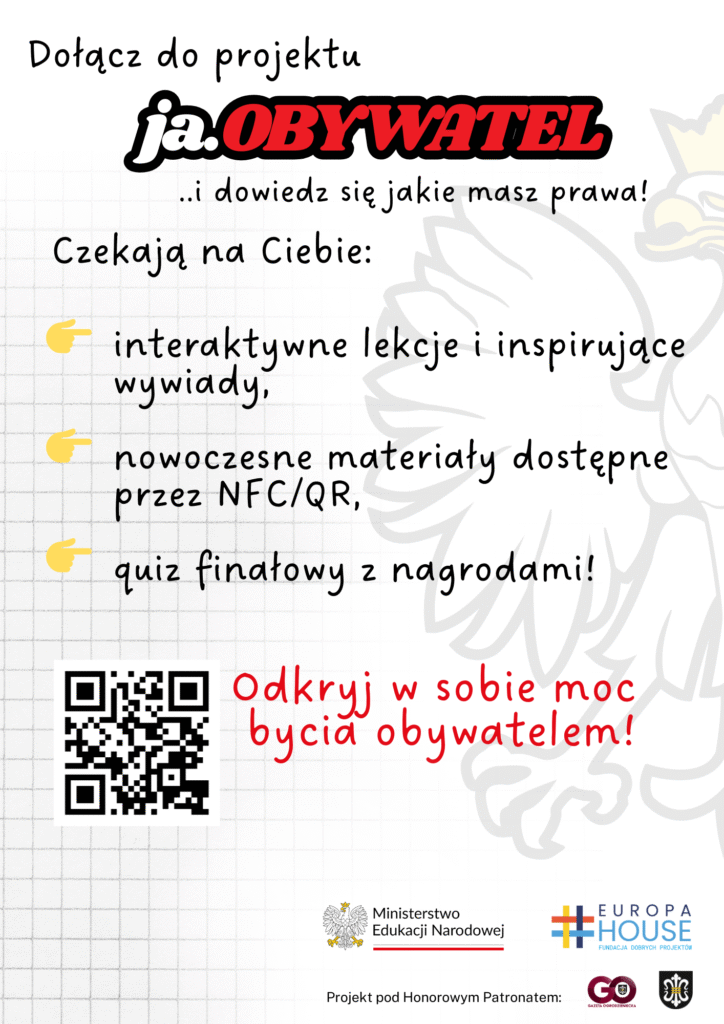 Projekt „ja.OBYWATEL” Fundacji Europa House to inicjatywa edukacyjna skierowana do młodzieży z gminy Ogrodzieniec i okolic, która rozwija świadomość obywatelską poprzez interaktywne lekcje, nowoczesne materiały, konkursy oraz spotkania z ekspertami, budując zaangażowanie i wiedzę społeczną.